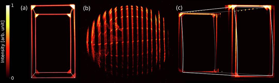 a) Imagen de calibración del cuboide en reposo. La imagen se superpone con una simulación de perspectiva del cuboide desde la posición de la cámara. b) Rotación de Terrell de una esfera moviéndose intencionalmente contraída por Lorentz a el 99.9 % de la velocidad de la luz. c) Rotación de Terrell de un cubo. Se superpone una simulación (contornos blancos) sobre los resultados experimentales para guiar la vista y verificar la descripción teórica. Crédito: D. Hornof et al., Comm. Phys., 2025.