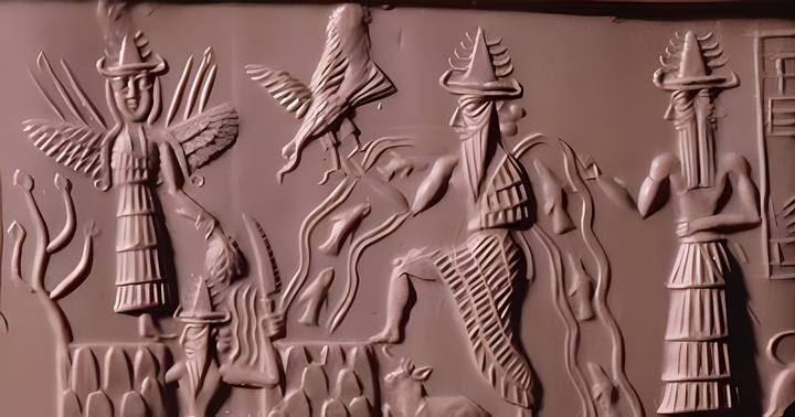 Impresión de un cilindro sello mesopotámico (sumerio o acadio, ca. III milenio a.C. - II milenio a.C.). La figura central es a menudo identificada como el dios sumerio Enki, dios de las aguas, la sabiduría y la creación.