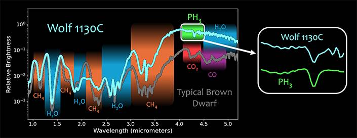 Ahora, un equipo de investigadores dirigido por Adam Burgasser, profesor de Astronomía y Astrofísica de la Universidad de California en San Diego, ha reportado la detección de fosfina en la atmósfera de una enana marrón fría y antigua llamada Wolf 1130c, situada a 54 años luz de la Tierra en la constelación del Cisne.